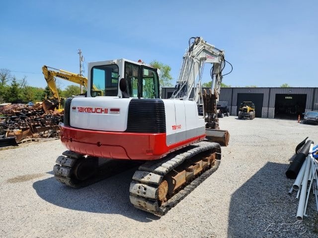 This 34,000 lb Takeuchi TB1140 excavator from 2015 has logged 4,111 hours of work and is ready for the job site. The machine features a comfortable cab with heat and air conditioning, making extended work shifts more manageable.