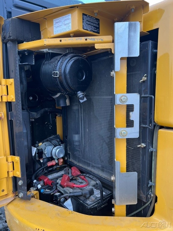 The excavator is equipped with a pattern changer, Roadliner pads, manual coupler, and a 24-inch bucket. It features 2-speed capability for efficient operation at different job requirements. The cab provides operator comfort with heat, cold air conditioning, and a radio.