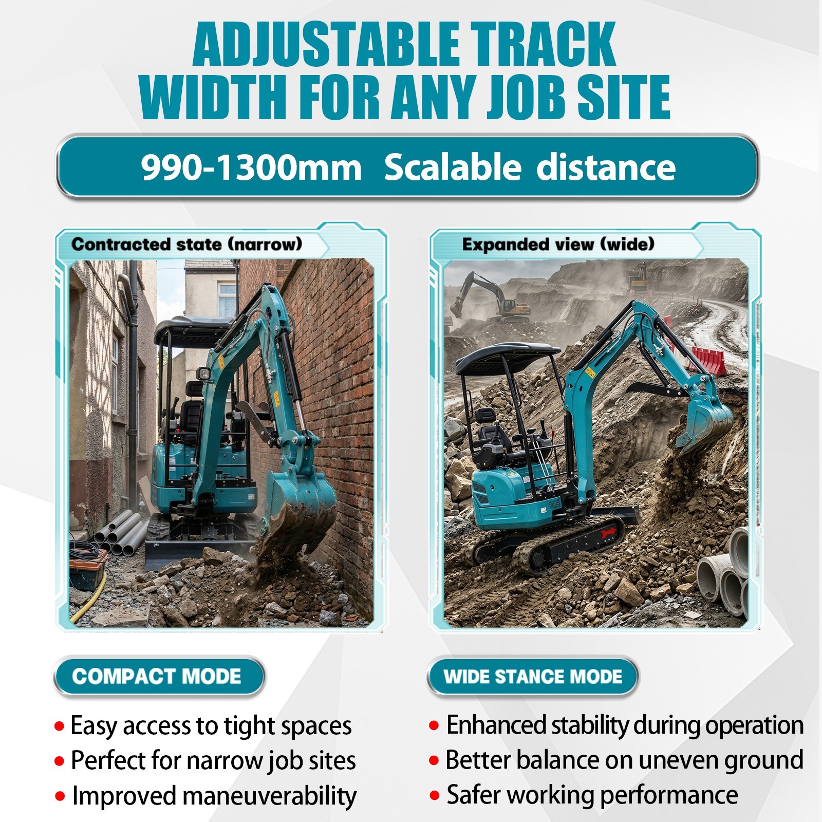 Kubota Diesel Engine – dependable, fuel-efficient, and built for long-lasting performance. Backyard and narrow access jobs. Compact 2.5 Ton Design – powerful enough for serious jobs while still easy to transport.
