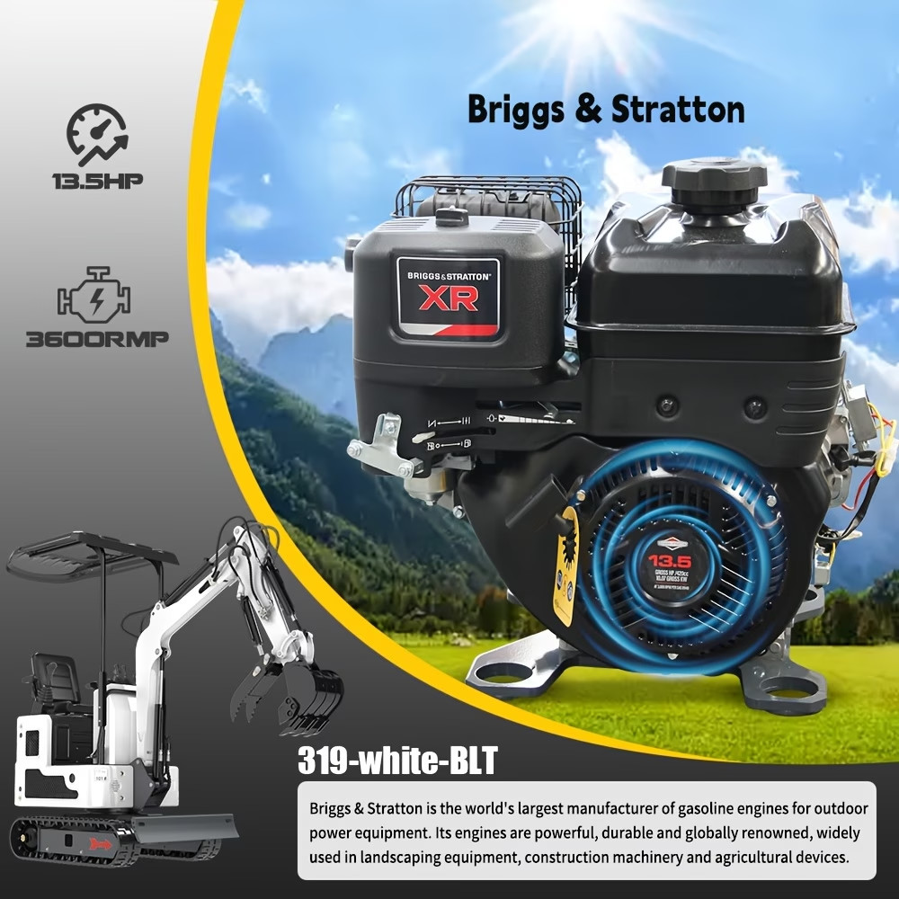 This compact mini excavator brings serious digging power to tight spaces. Powered by a reliable Briggs & Stratton engine producing 13.5HP, it delivers the muscle needed for landscaping, indoor construction, and small-scale digging work without requiring much room to operate.