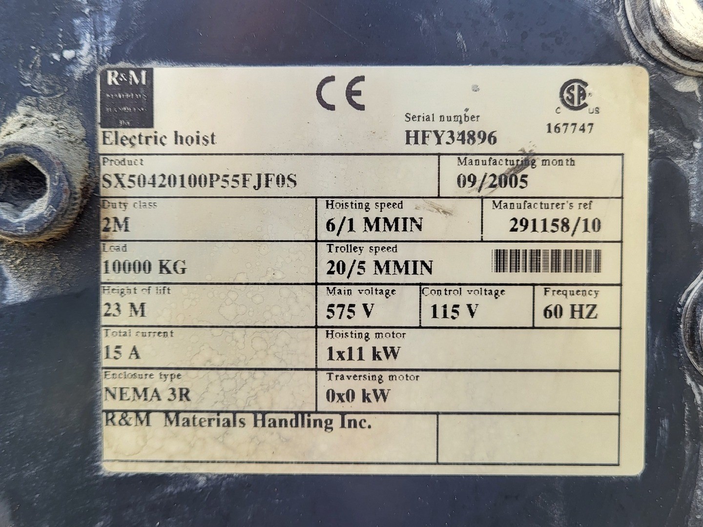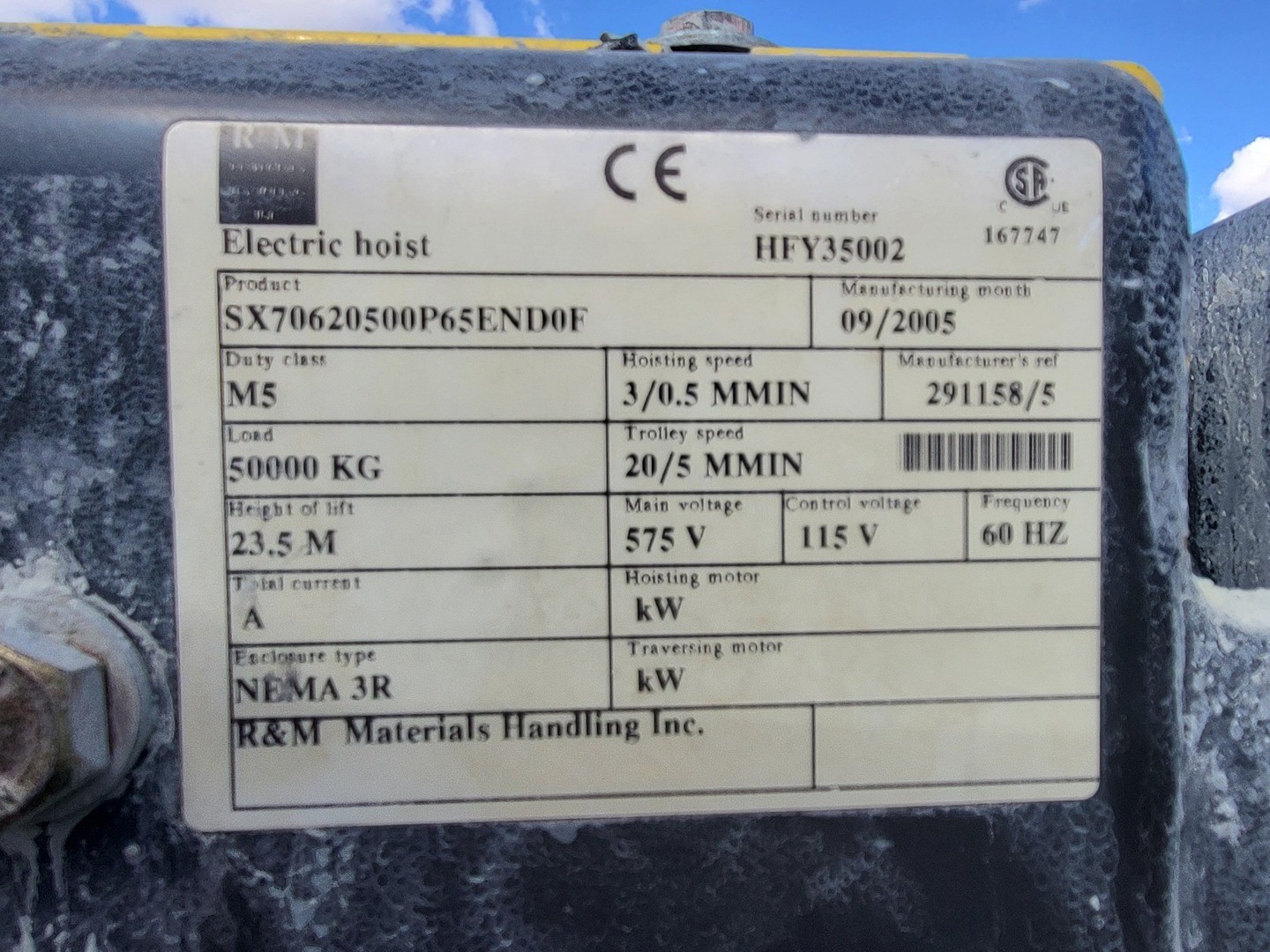 Model SX70620500P65END0F. Product Code: SX70620500P65END0F. SPACEMASTER SX 50-TON WIRE ROPE ELECTRIC HOIST W/ 10-TON AUXILIARY HOIST. Rope Drum Length: 2800mm. Rope Drum Length: 1600mm. Year: 2005. Trolley Type: Food Mounted.