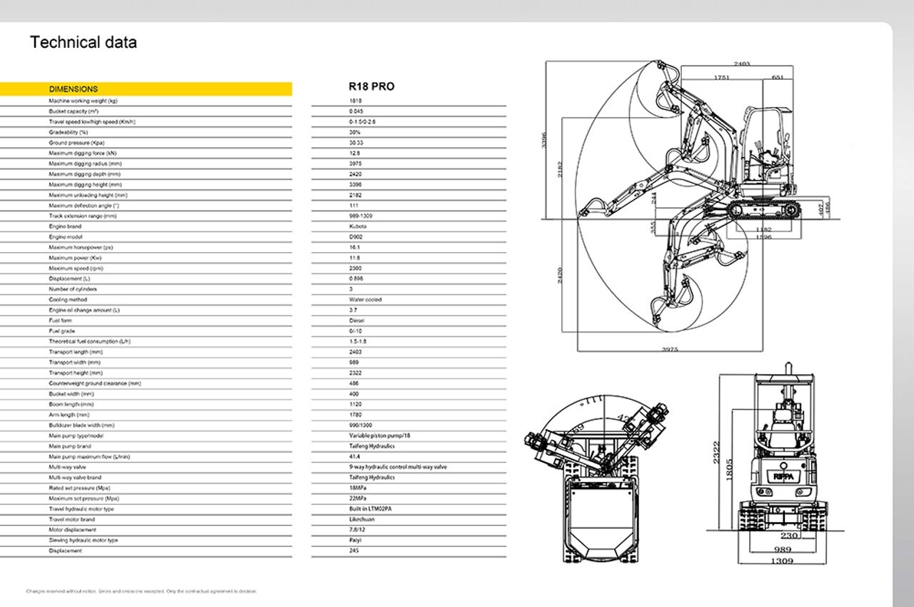 Engine: Kubota D902. Foldable and retractable bucket and boom design, can also play an excellent working ability in a small space. Equipped with quick connection device, various working tools can be easily replaced to improve work flexibility.