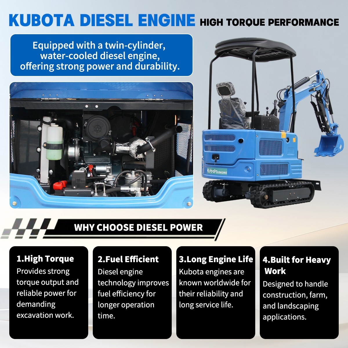 The engine is a durable and energy - efficient Kubota Z482 diesel engine. Designed for contractors only, not suitable for light residential construction.