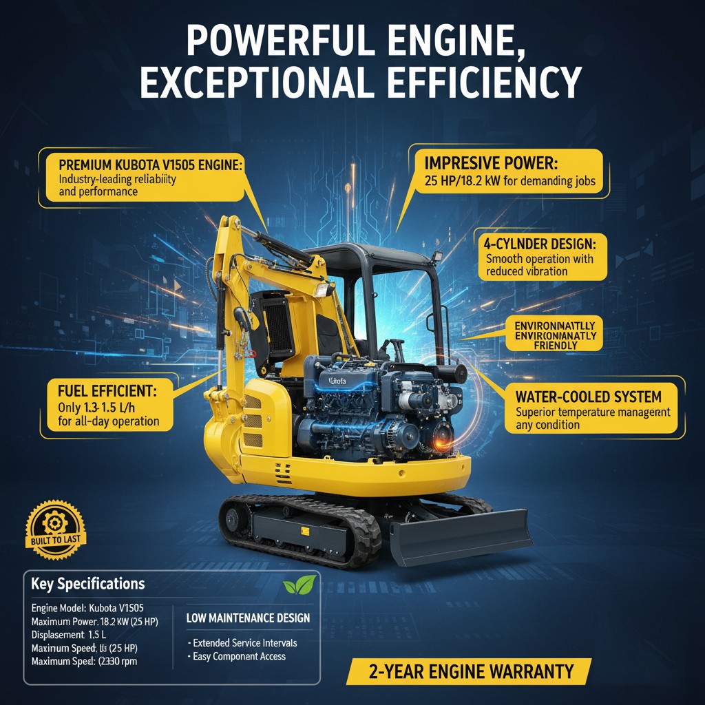 This 3.5-ton mini excavator is powered by a Kubota V1505 4-cylinder water-cooled diesel engine and designed for versatile earthmoving tasks. The machine features pure pilot operation with a load-sensitive variable piston pump for smooth, efficient performance.