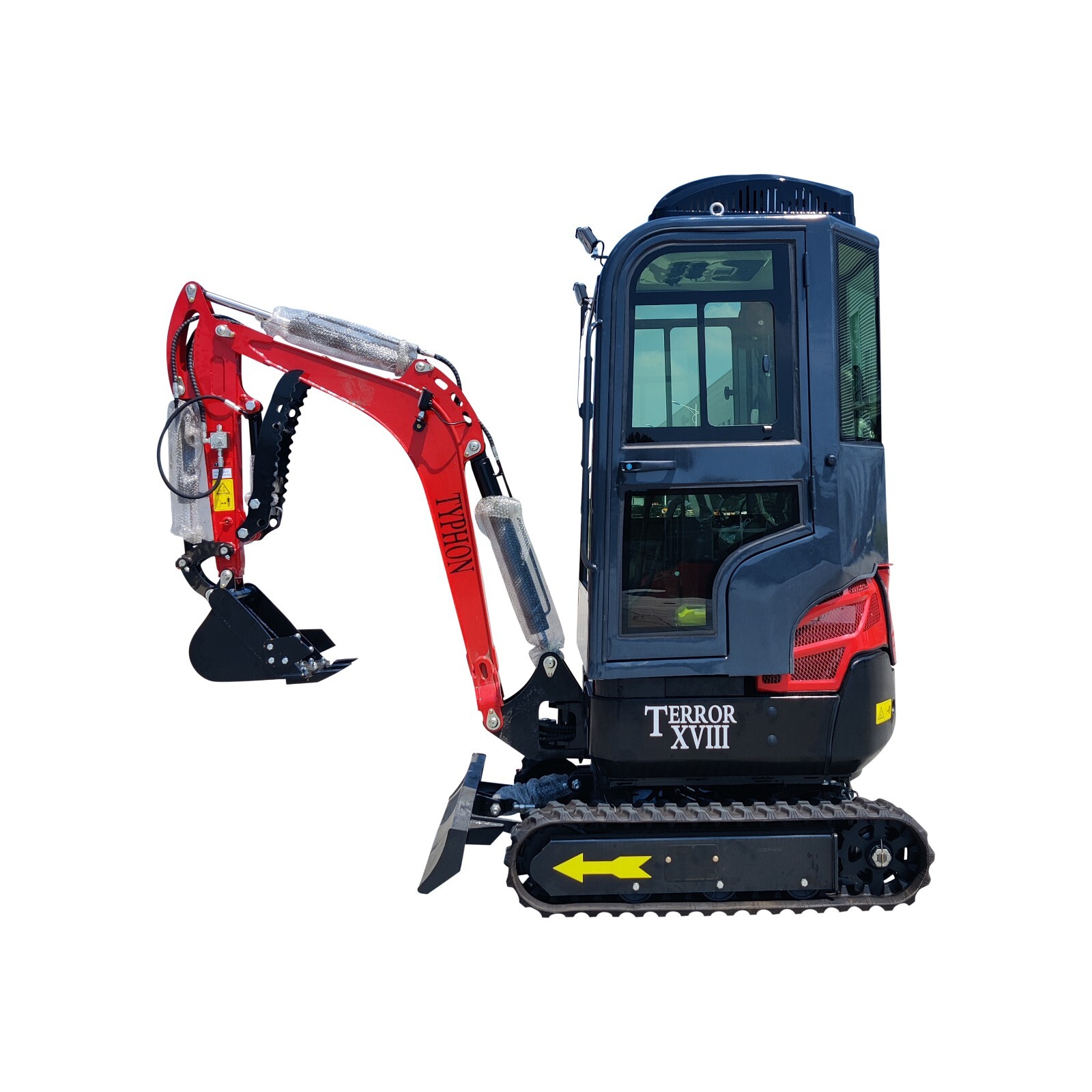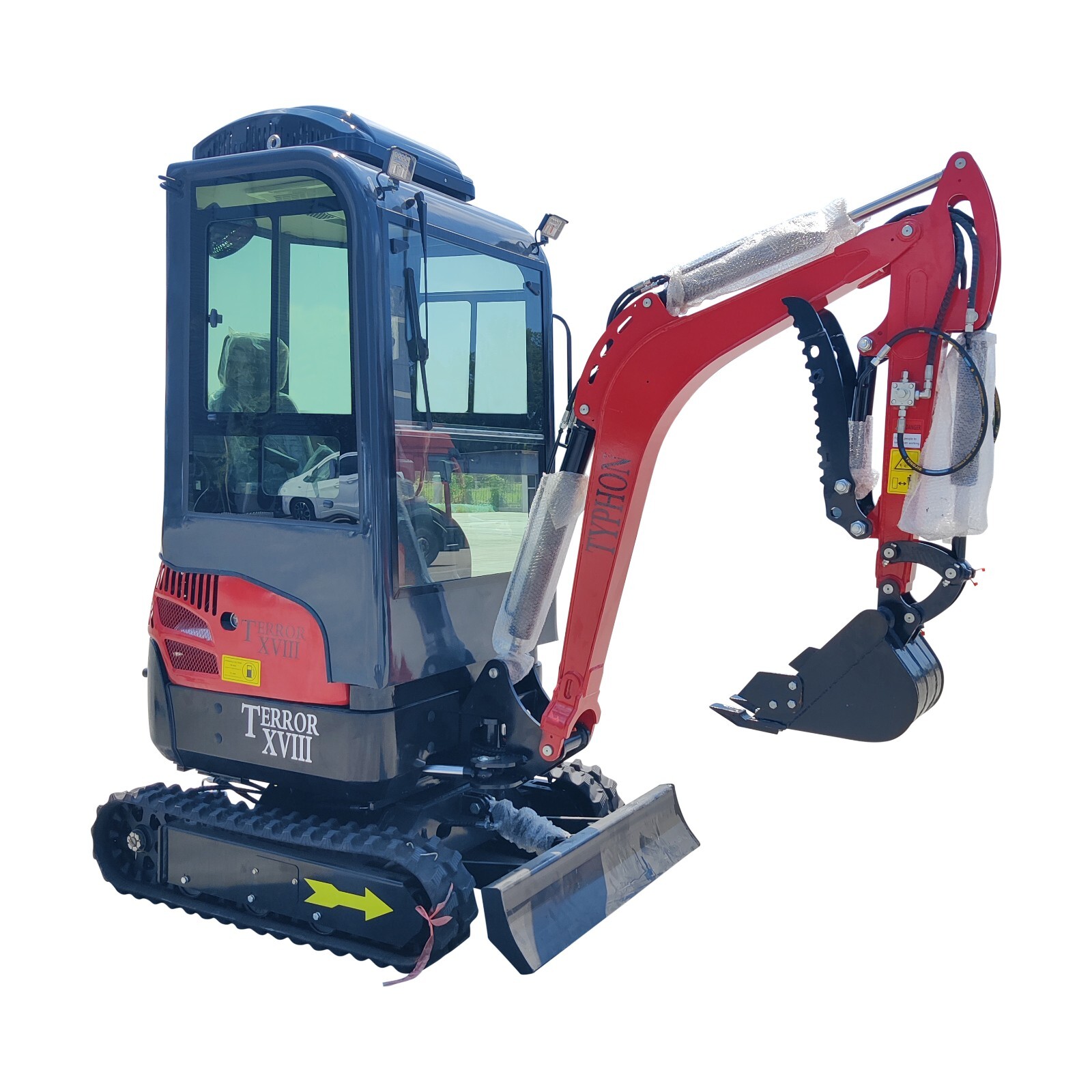 The TYPHON TERROR XVIII is a two-ton trench digger designed for small to medium projects across gardens, farms, parks, and roads. This mini excavator features a climate-controlled cabin with air conditioning and heating, making it comfortable for extended use in various weather conditions.