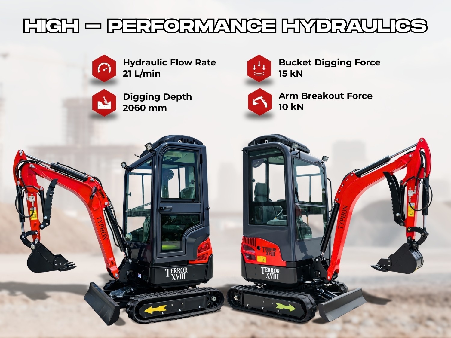 Ideal for landscaping, municipal works, small construction sites, and agricultural projects, the TYPHON TERROR XVIII combines power and precision in a compact package designed for professionals and property owners alike.