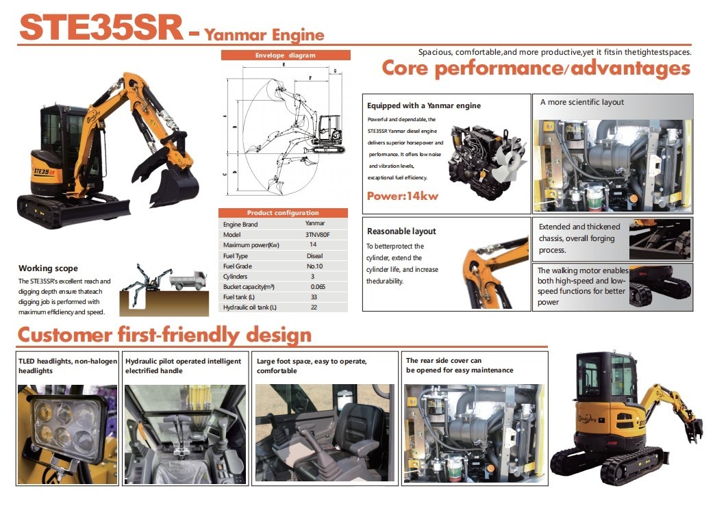 STE35SR DETAIL SHOWS. STE35SR SPECIFICATION. Yanmar Diesel Engine | Perfect for Professional and DIY Projects. Operator Comfort – Spacious cab with large windscreen, sunroof, warm air conditioner, and touch radio.