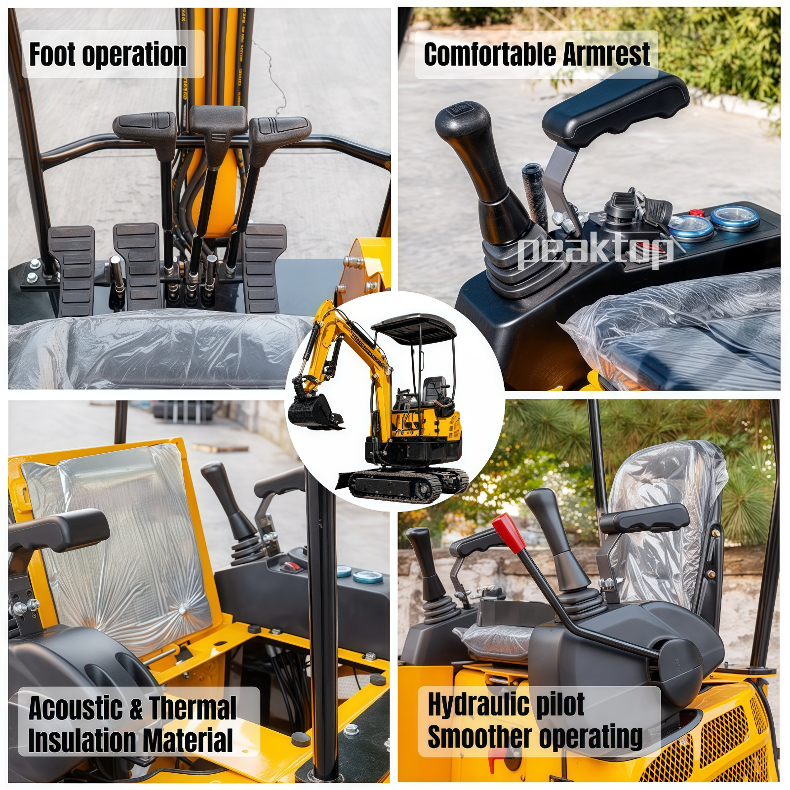 Equipped with a standard canopy and telescopic functions, it prioritizes operator safety without sacrificing flexibility. The 0.03m³ bucket reaches a maximum digging height of 2690mm and maximum depth of 1710mm, handling small-scale digging and loading tasks with ease.